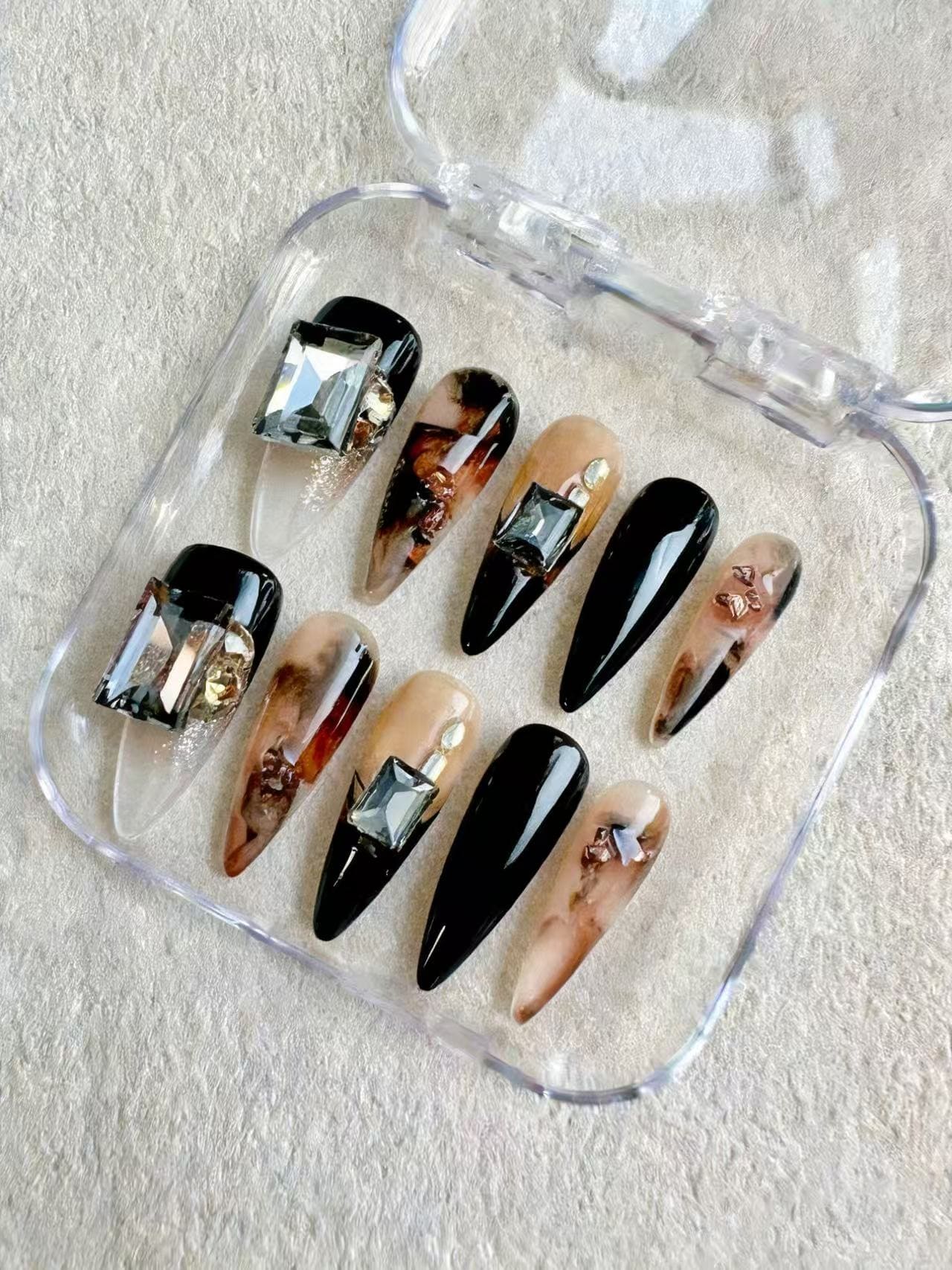 Embrace the thrill of risk with Amber Dusk, our press on nails adorned with Swarovski crystals. Elevate your style and make a statement with every move. Take on the night with confidence and shine bright like a crystal!