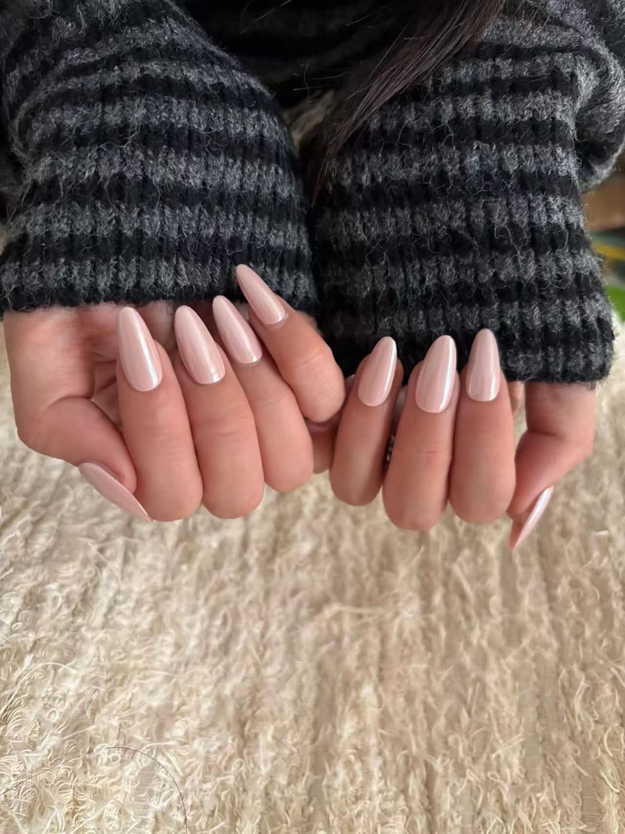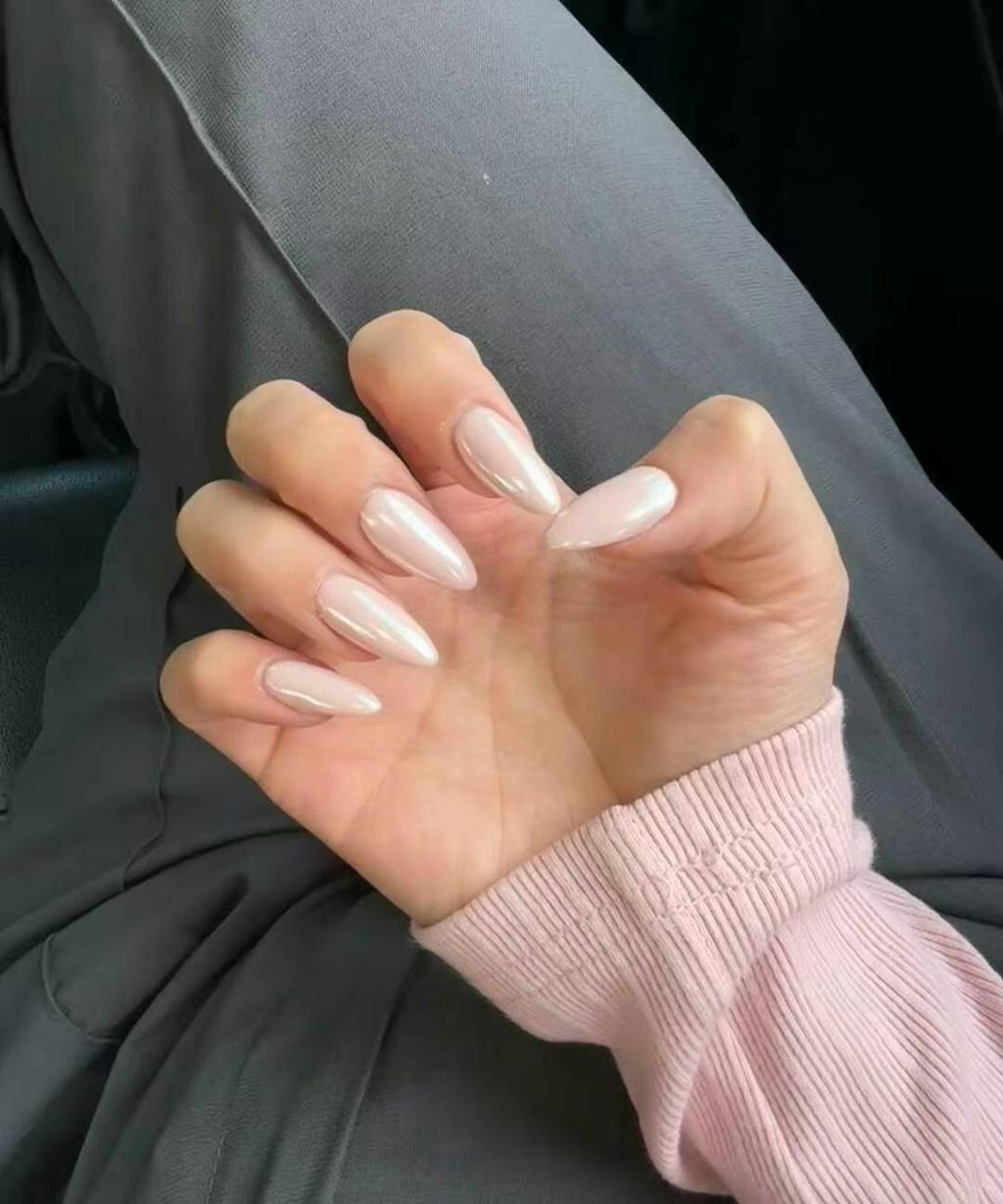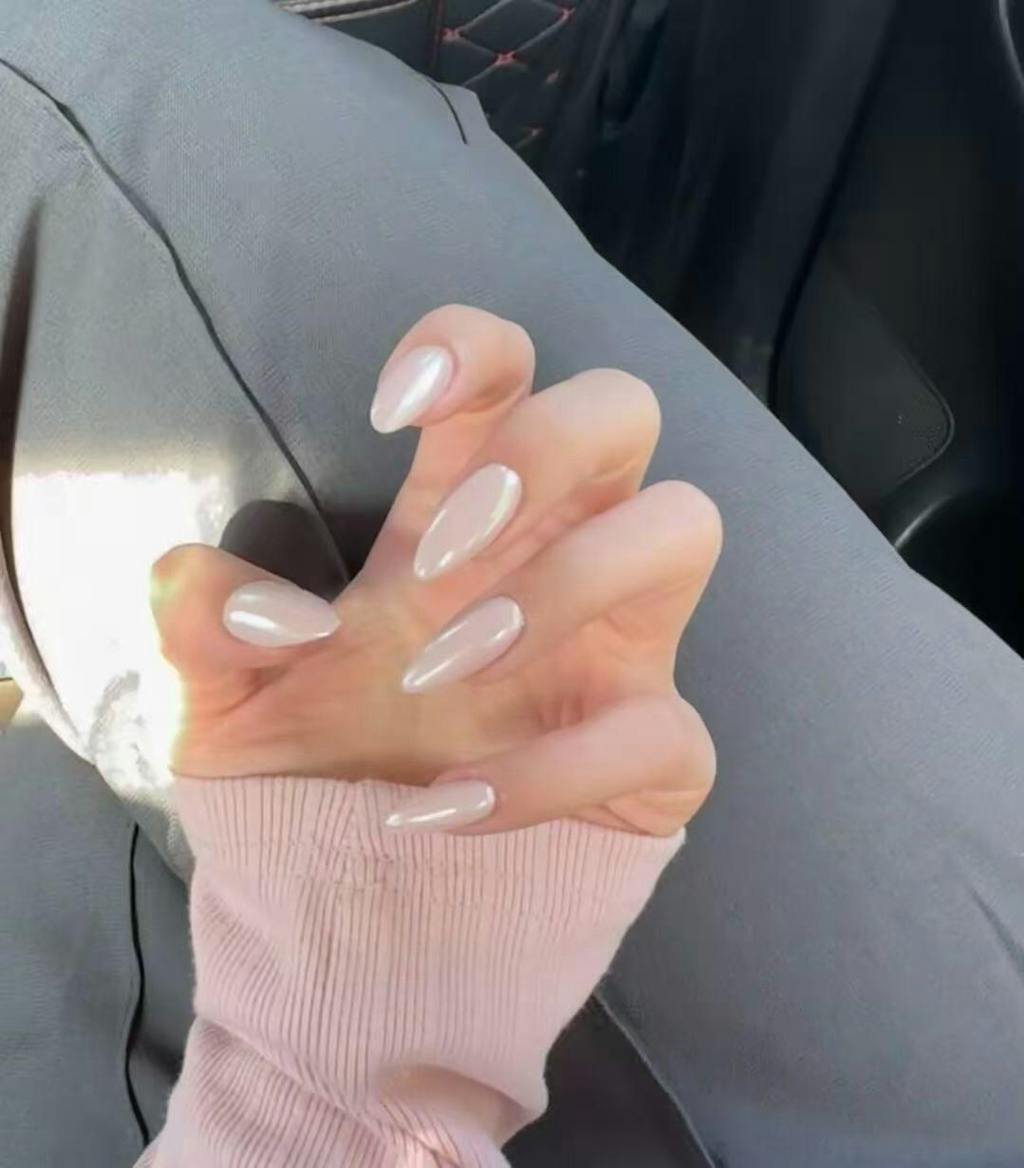 Each nail is bathed in a uniform peach-pink hue, infused with the finest shimmer that shifts gently in the light, just like the inner lining of a mother-of-pearl. The result is a finish that feels alive—subtle enough for daylight, mesmerizing enough for candlelit evenings.