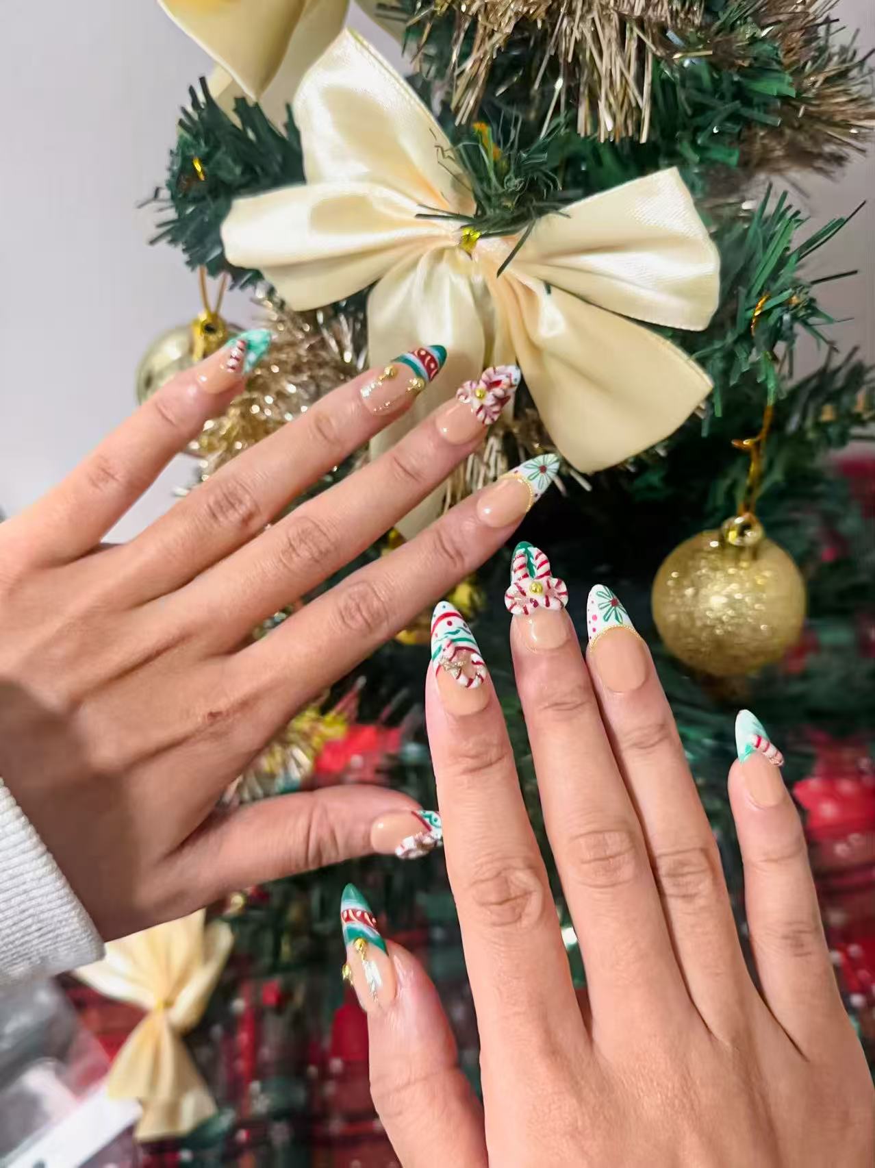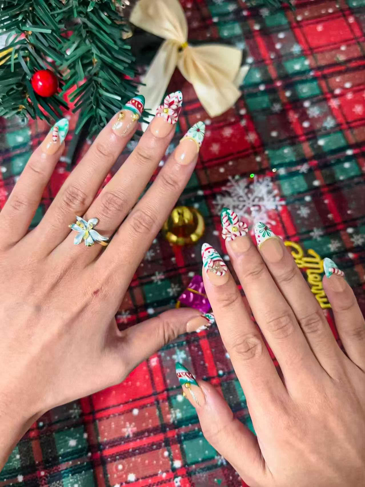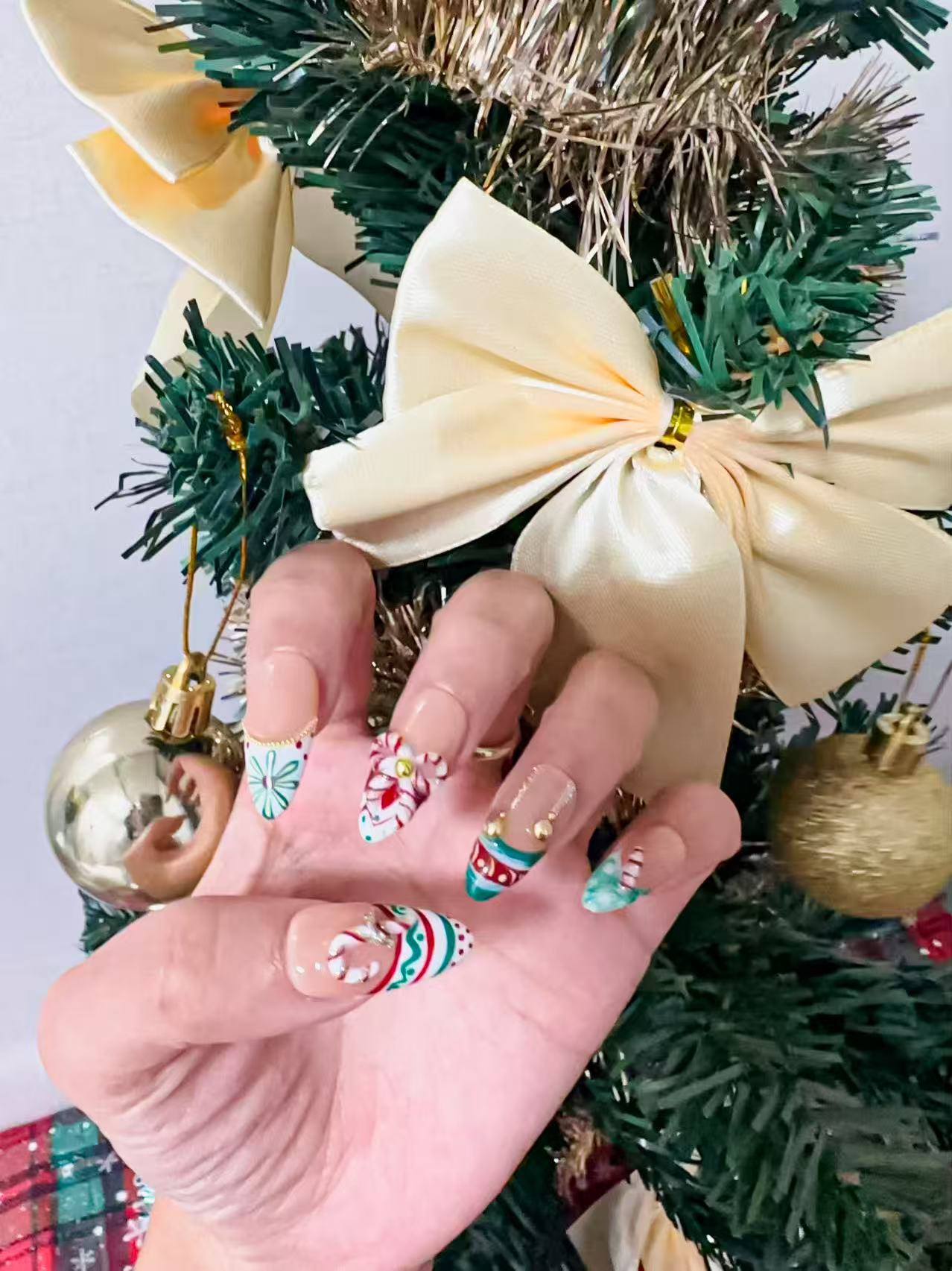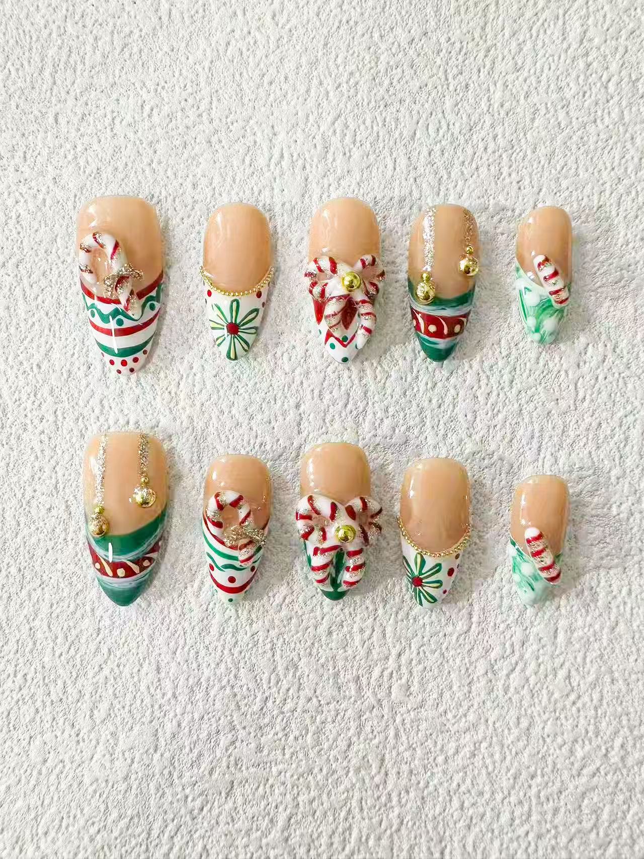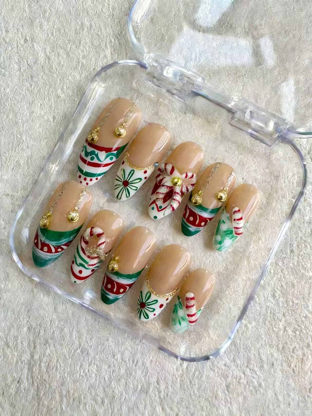 Carry the sweet elegance of a classic Christmas in the palm of your hand. "Vintage Confection" offers a light, retro-inspired look with a touch of sophistication. A sheer nude base provides a soft canvas for timeless red and green stripes and polka dots, framed by elegant gold metallic tips. The real conversation starter? A beautifully sculpted resin candy cane accent that whispers of vintage sweetness and holiday refinement.